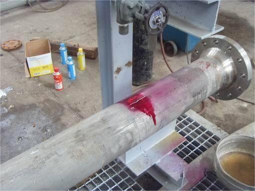 在被檢表面施加滲透劑前,應使用清洗劑將工件表面清洗干凈,使得被檢表面無油污、銹蝕、切屑、漆層及其他污物(如檢驗焊縫時,在焊縫表面及焊縫邊緣不應有氧化皮、焊渣、飛濺等污物),然后,使得被檢工件表面要充分干燥。